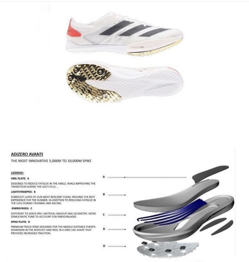 Comme Nike, Adidas devrait sortir 2 modèles : un pour les distances « courtes » (800-1500 voire 400) et un pour les distances « longues » (1500-10 000). En gros : la Adizero Ambition sera l’équivalent de la Air Zoom Victory et la Avanti Pro de la Dragonfly.