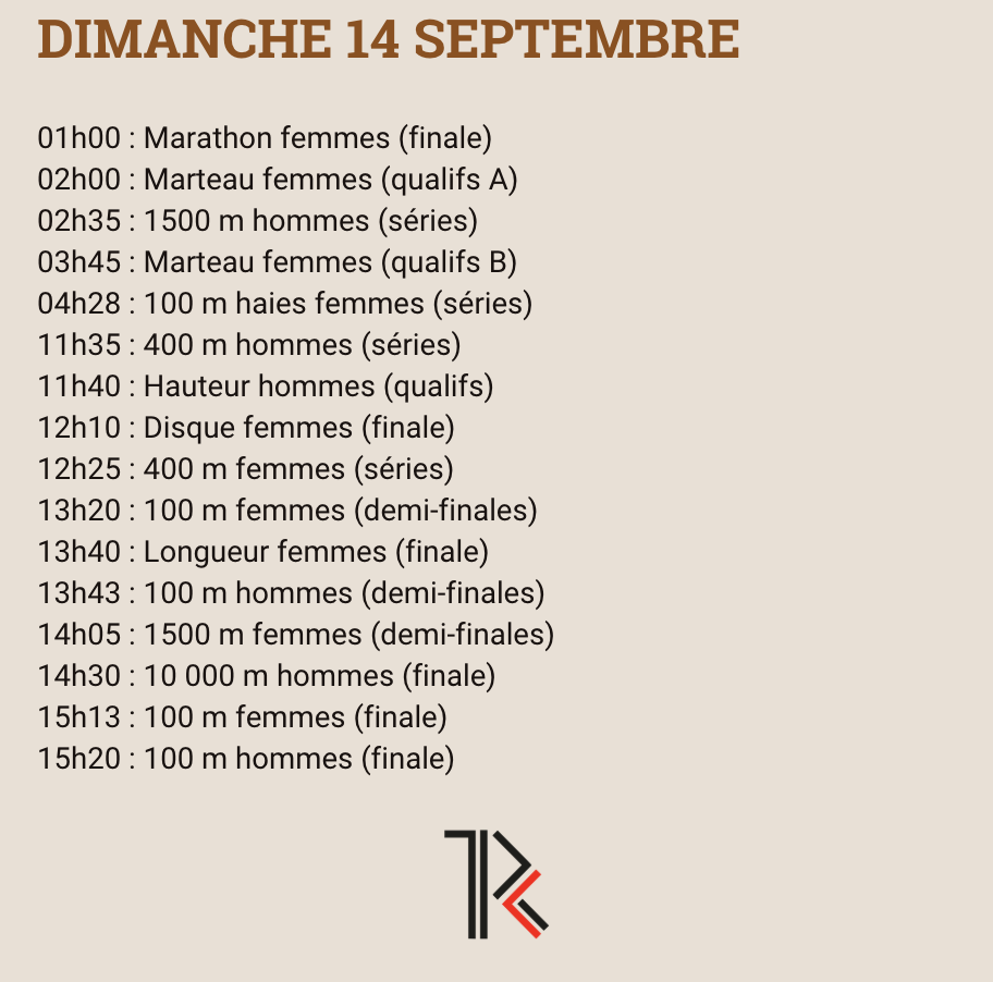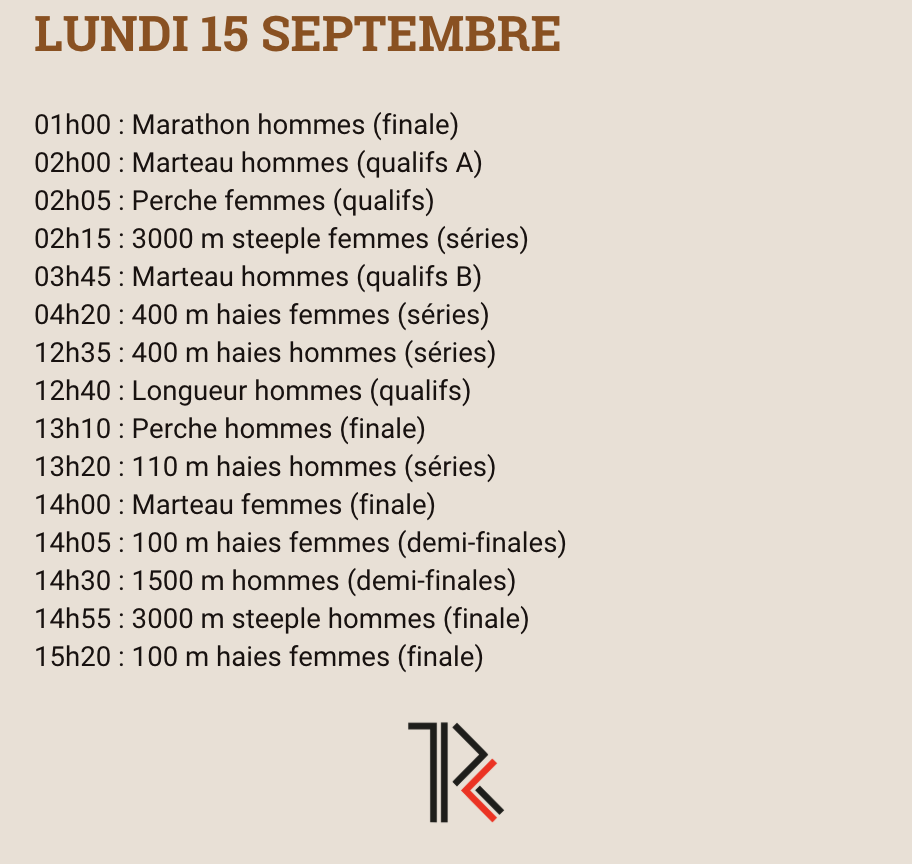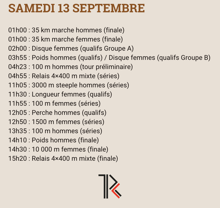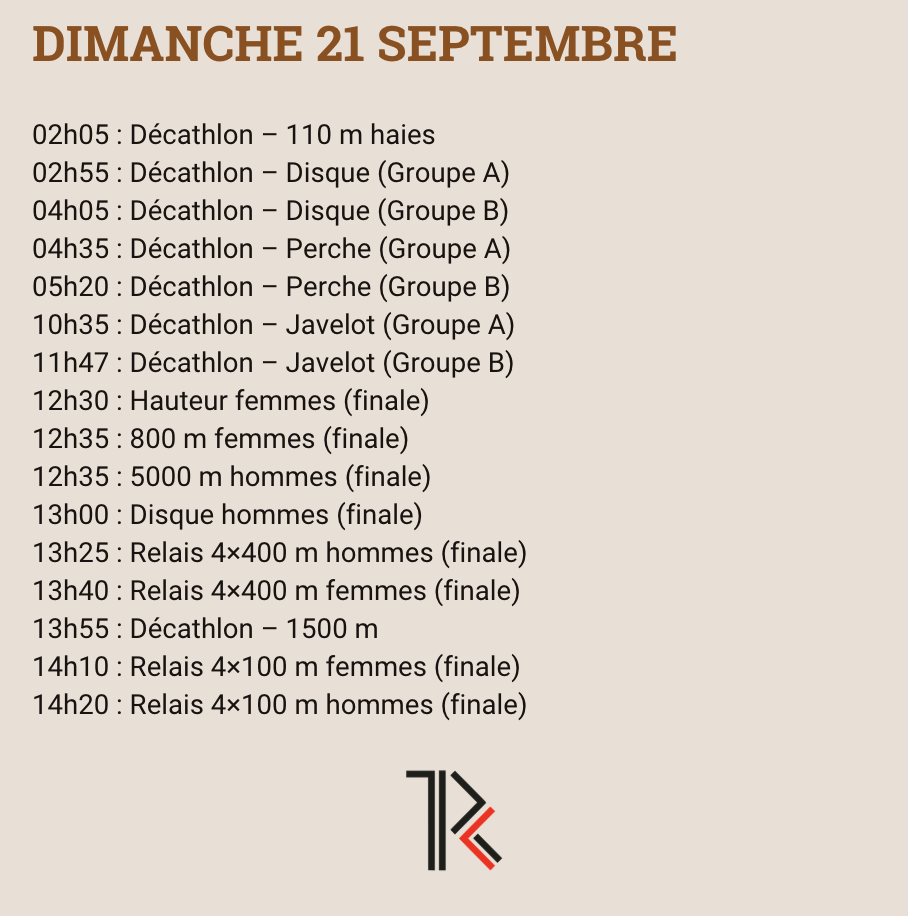 Les compétitions s’étaleront sur neuf journées, du samedi 13 au dimanche 21 septembre 2025, dans le flamboyant Stade National de Tokyo. Du fait du décalage horaire avec le Japon (+7h), les sessions auront lieu :
