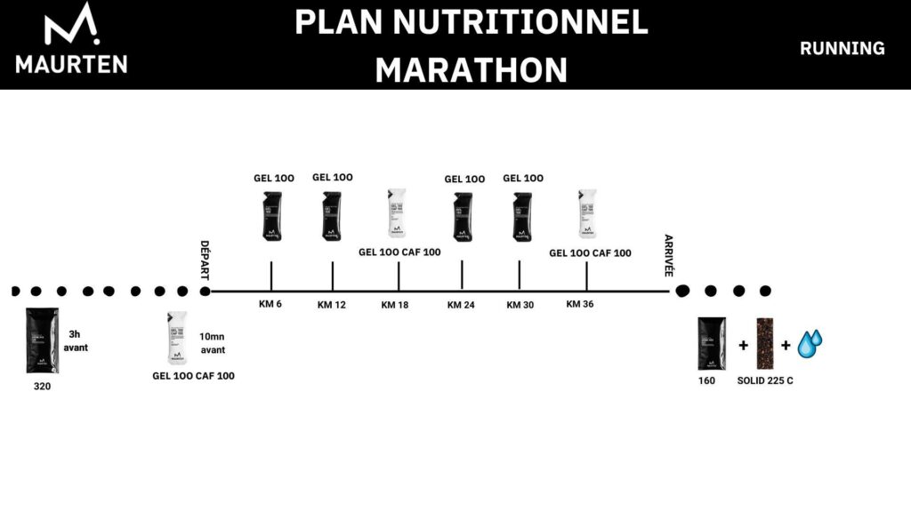 Vous pouvez directement sur le site de Maurten trouver des plans nutritionnels qui vous permettent de savoir quels gels prendre à quel moment de la course. Voici le plan si vous préparez un marathon :