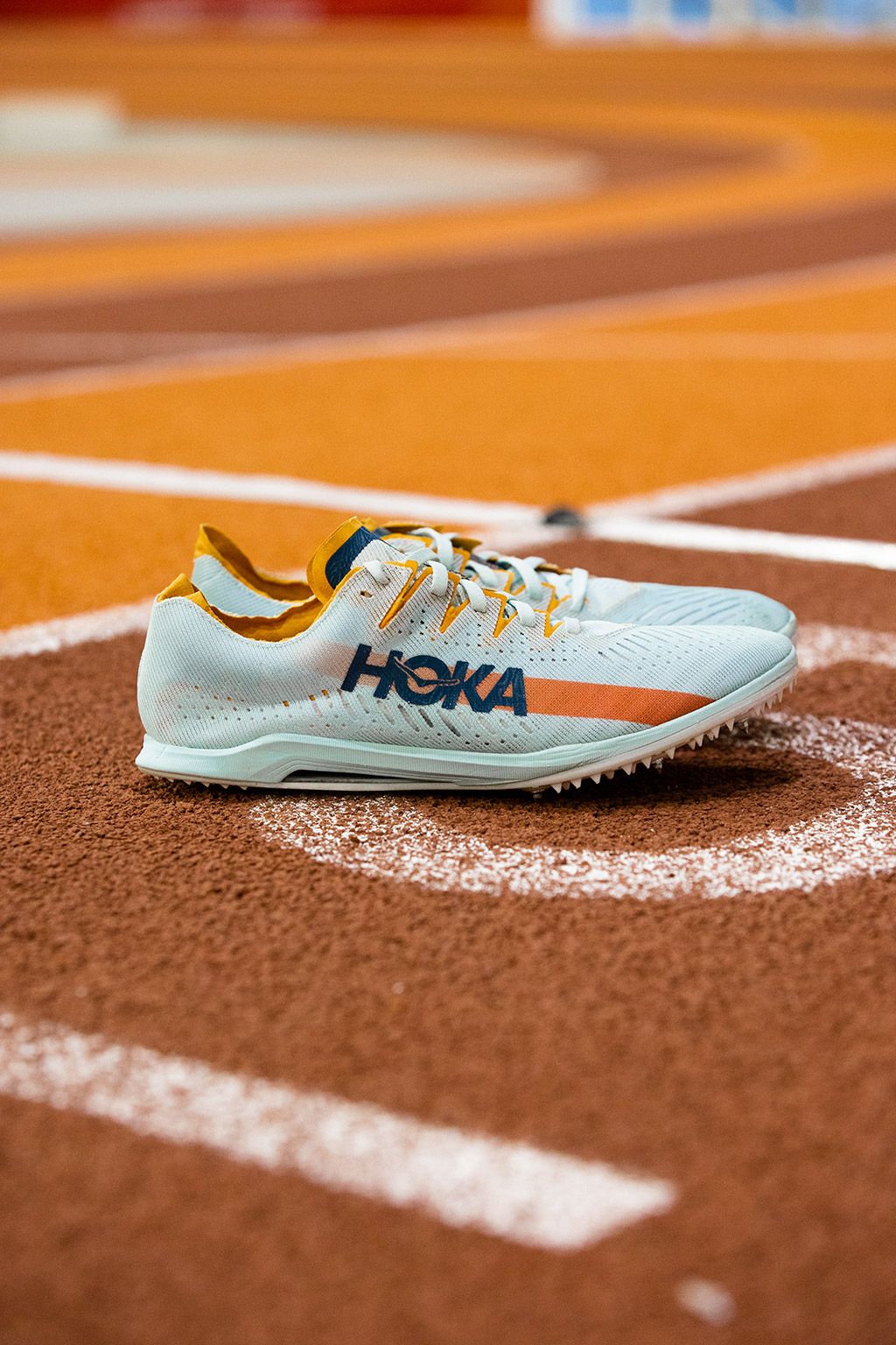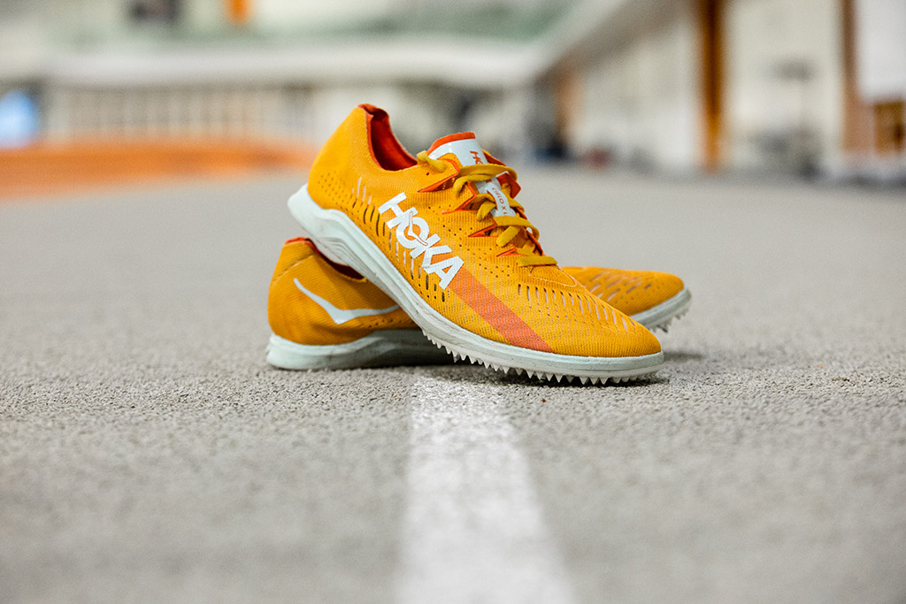 « Si Hoka est à l’origine un fabricant français de chaussures de Trail avec BEAUCOUP d’amorti, depuis son rachat par le groupe américain Deckers en 2013, la marque a progressivement développé des produits plus légers et a élargi sa gamme avec des produits performants pour l’entraînement et la compétition sur route et sur piste. Bien que ce développement de Hoka n’était pas forcément connu en France jusqu’à récemment (quand j’ai signé chez eux en janvier 2021 plus d’un m’a demandé si je me mettais au Trail) cela fait déjà quelques années que l’ont voit de plus en plus de demi fondeurs sur route et piste aux États Unis porter les couleurs Hoka. Je pense notamment à Kyle Merber qui a couru 3:52 au Mile indoor en 2017 en pointes Hoka, ou encore le groupe NAZ Elite basé à Flagstaff. La gamme Hoka s’est particulièrement développée ces derniers mois, avec deux modèles de pointes de qualité, les Cielo X MD et LD. Ces chaussures ont été vues aux pieds de plusieurs athlètes aux Jeux Olympiques, comme Luis Grijalva, Rachel Schneider ou encore Hillary Bor. Après s’être faites longtemps désirées (elles sont dispos pour les athlètes sponsorisés depuis Février 2021) les deux modèles sont accessibles au grand public. La Cielo LD comme la MD sont toutes les deux équipées d’une plaque carbone, ce qui en fait des chaussures dynamiques, et le chausson fabriqué d’un tissu léger assure une bonne « respirabilité » ainsi qu’un bon maintien. Mis à part ça, il y a une différence assez marquante entre les deux modèles. Comme leur nom l’indique, la MD sera appréciée par les coureurs de 800-1500, la LD sera préférée par les coureurs de long. Commençons par la MD. Dès qu’on l’enfile, on sent une similitude avec un modèle que j’ai particulièrement apprécié avant la sortie des pointes carbone, à savoir la Nike Victory 3. On se sent en effet très proche de la piste, contrairement aux modèles récents où l’on a plus l’impression de courir sur une mousse, mais on a quand même le petit plus de dynamisme grâce au carbone. La mousse pour l’amorti est présente mais sans excès, et on ne la sent pas beaucoup. Il y a également une plaque en Pebax reliée au talon où sont fixées les pointes, pour encore plus de réactivité au sol. Clairement l’objectif de ces pointes est de vous propulser au maximum (ce que l’on ressent clairement). En revanche, la fatigue musculaire peut survenir très vite. Entre les deux plaques pour la propulsion et la sensation d’être proche du sol, les mollets sont extrêmement sollicités et les courbatures sont presque systématiquement présentes le lendemain, quelle que soit la séance effectuée. C’est en cela qu’elles différent vraiment des Dragonfly. On note aussi que la plaque supplémentaire en fait un modèle a 128g, plus lourd que le modèle LD. Enfin, l’accroche à la piste est excellente avec de quoi fixer 6 clous et quelques petits “pics” en plastique bien répartis. J’ai d’ailleurs moi même équipé ce modèle de pointes de 12mm lors d’un cross long en Bretagne et je n’ai pas eu à me plaindre de l’accroche.