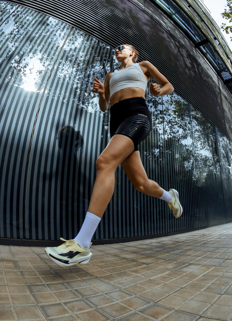 Chaque gramme a été pensé : mesh ultra-fin, semelle affinée aux zones non critiques, lacets techniques allégés. Le résultat est une chaussure qui vous pousse naturellement vers l’avant-pied et encourage l’accélération.