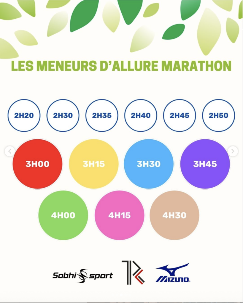 Sur le marathon, plusieurs allures seront proposées : Allures rapides : 2h20, 2h30, 2h35, 2h40, 2h45, 2h50; Allures intermédiaires : 3h00, 3h15, 3h30, 3h45; Allures accessibles : 4h00, 4h15, 4h30.