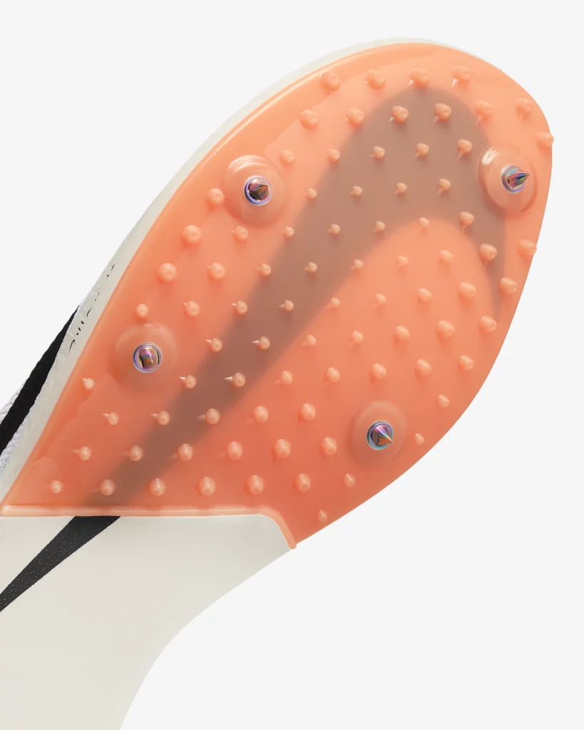 - seulement 4 pointes au lieu de 6 : pour réduire le poids de la chaussure, le métal étant le matériel le plus lourd. Les ingénieurs de la marque américaine se sont aussi rendus compte que 4 pointes suffisaient donc pourquoi en ajouter plus ?