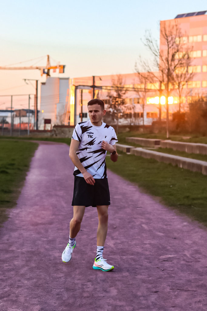« Je n’avais jamais couru avec des chaussures « next gen » avant de passer chez Saucony donc je n’ai pas vraiment de point de comparaison avec les concurrents directs. Par contre, je peux assurer que je sens un vrai gain quand je cours avec ces chaussures, la Speed comme la Pro. La pro est vraiment très dynamique, elle est vraiment légère et peut rappeler une Streak, mais une Streak qui aurait un vrai amorti. Et puis il y a ce fameux effet « rebond » que je ne peux comparer avec aucune chaussure que j’ai portée auparavant. Il n’est je pense pas aussi prononcé sur ce modèle que sur d’autres marques car me concernant je n’ai pas eu besoin de temps d’adaptation. Je me suis tout de suite senti bien dedans. Le truc qui m’a sidéré c’est le côté « économie d’énergie » qu’on ressent au fur et à mesure de l’effort. Sur mon 5km en 14’10 je suis parti sur des allures où habituellement je commence à subir vers le 3-4ème kilomètre. Là non, ma foulée n’a pas changé et j’ai réussi à vraiment maintenir mon allure. Personnellement j’adore.«