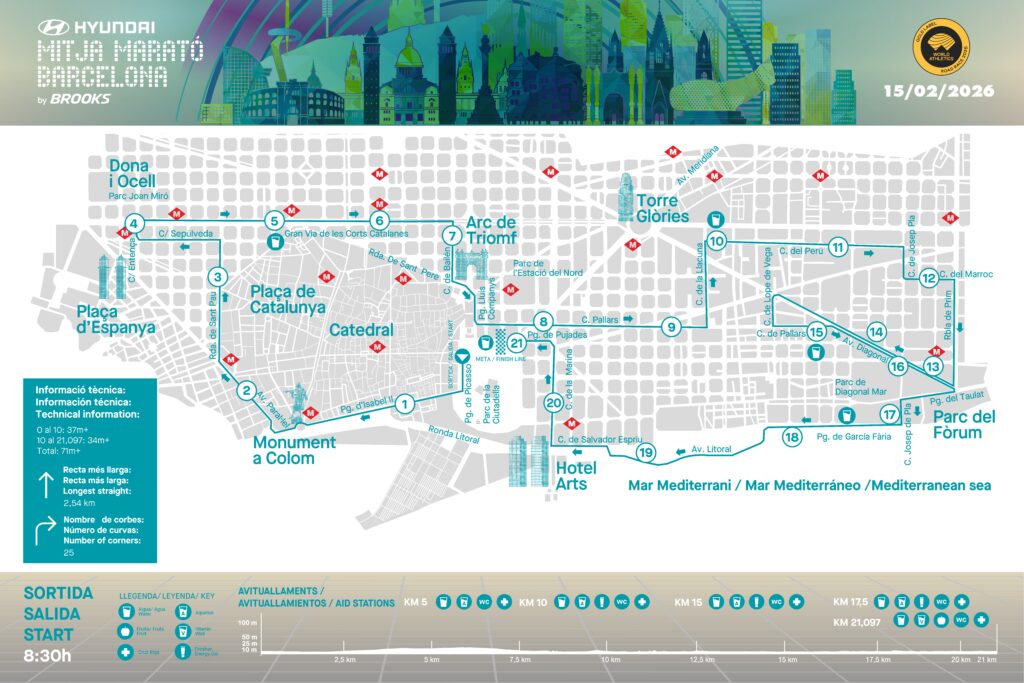 Le circuit du semi-marathon de Barcelone est réputé pour être l’un des plus rapides d’Europe. Le départ est donné au niveau de l’Arc de Triomf, puis les coureurs traversent la capitale catalane en passant devant plusieurs monuments historiques emblématiques : la Sagrada Família, le Parc de la Ciutadella, la Torre Glòries et les larges avenues de l’Eixample. La grande ligne droite sur l’Avenida Diagonal constitue l’un des moments forts du tracé, permettant aux athlètes de se lancer dans un rythme soutenu.