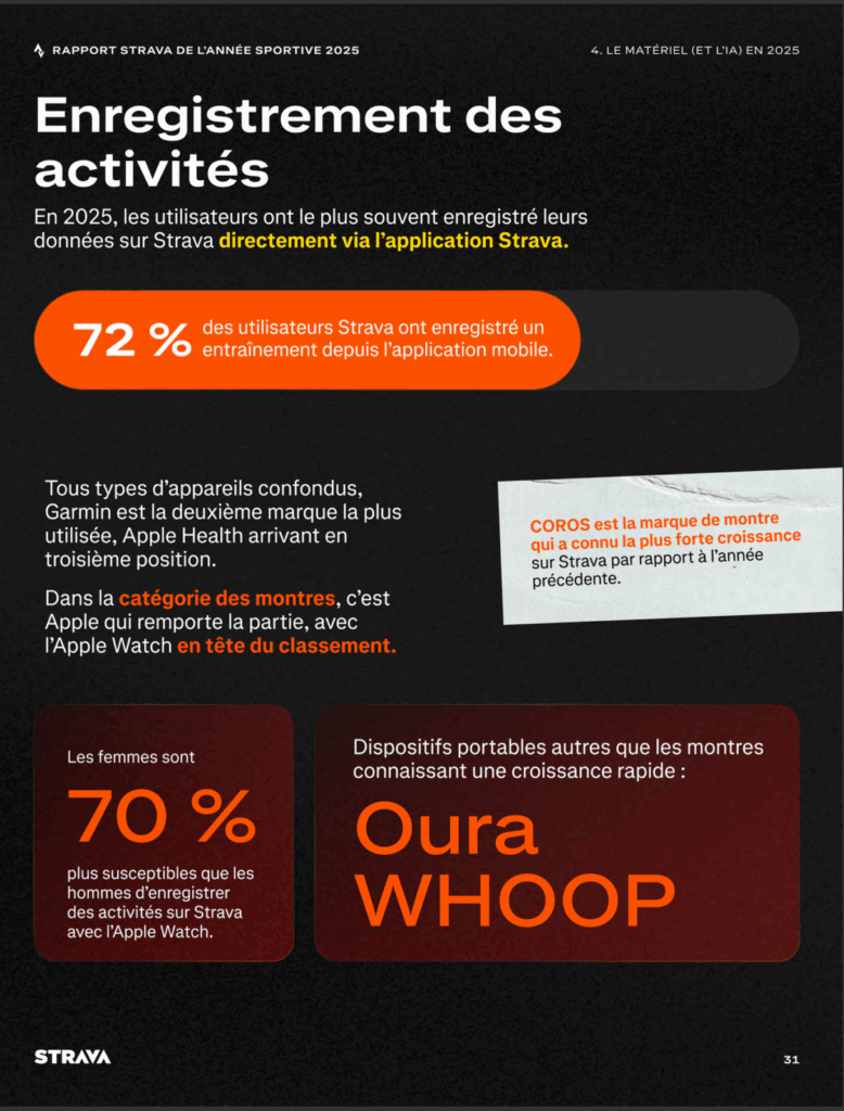 COROS signe la performance la plus impressionnante de l’année avec la plus forte croissance enregistrée sur Strava par rapport à 2024. Cette progression fulgurante ne doit rien au hasard : la marque chinoise a su conquérir les coureurs les plus exigeants grâce à un rapport qualité-prix redoutable et une autonomie exceptionnelle qui surpasse souvent la concurrence.