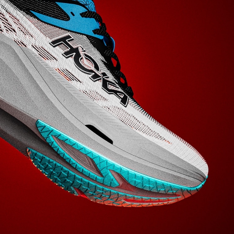 La technologie révolutionnaire de la plaque se manifeste par sa géométrie en forme de H, maximisant le retour d’énergie à chaque foulée. Son positionnement entre deux couches de mousse PEBA offre un équilibre parfait entre dynamisme et stabilité (une stabilité qui avait fait défaut sur certains modèles, notamment sur la Cielo X 2.0. Sur la Rocket X3, Hoka a assuré sur ce point : aucun problème de stabilité n’est à noter).