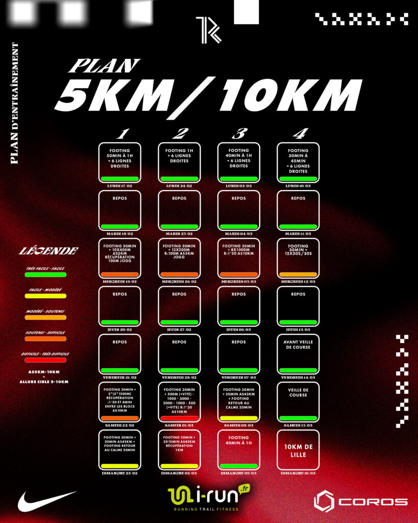 Nous vous donnons aussi accès gratuitement au plan d’entraînement que nous, athlètes TRC, suivons pour préparer le 10km de Lille. Il s’agit d’un plan sur 5 semaines, qui suppose donc de ne pas partir de zéro mais d’avoir déjà une bonne base foncière avant. Ne le suivez pas si vous n’avez pas déjà fait un mois de foncier (endurance), avant.